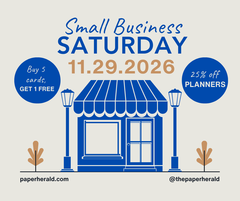 🛍️ Join us this Small Business Saturday and support local! Get 25% off all planners and calendars, plus buy five greeting cards and get one free. Thank you for shopping local!