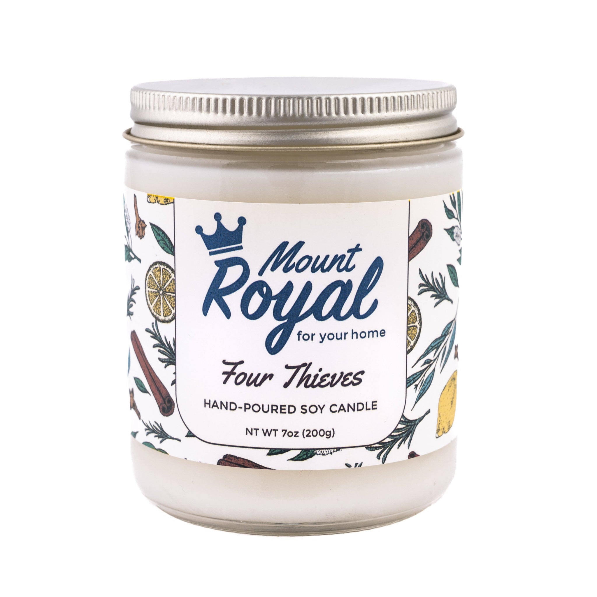 Legend has it, during the times of the bubonic plague there were four thieves who roamed the land robbing those who had met their demise. Allegedly, the vagrants were able to perform their dastardly deeds because they were protected by a concoction of herbs and spices they carried with them. Inspired by this story, behold our modern take on that cleansing remedy. Four Thieves has revitalizing notes of rosemary, clove, lemon, eucalyptus, and cinnamon, a fragrance that is sure to clear your mind (a great choice for meditation!). Burn time: 40 hours Weight: 7oz Dimensions: Height 3.5", Diameter 3" Ingredients: 100% soy wax, and (always!) phthalate-free fragrance oil Net Weight: 1 lb 3”x 3 1/2”x 3”